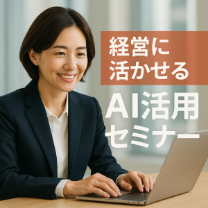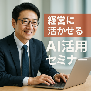 AI活用セミナーの広告用の正方形バナー画像を作成してください。 パソコンを使っている日本人の男性の写真を入れ 『経営に活かせるAI活用セミナー』の文字を入れてください。